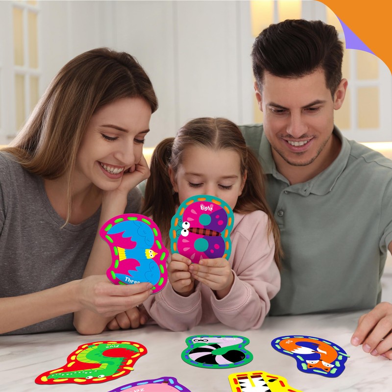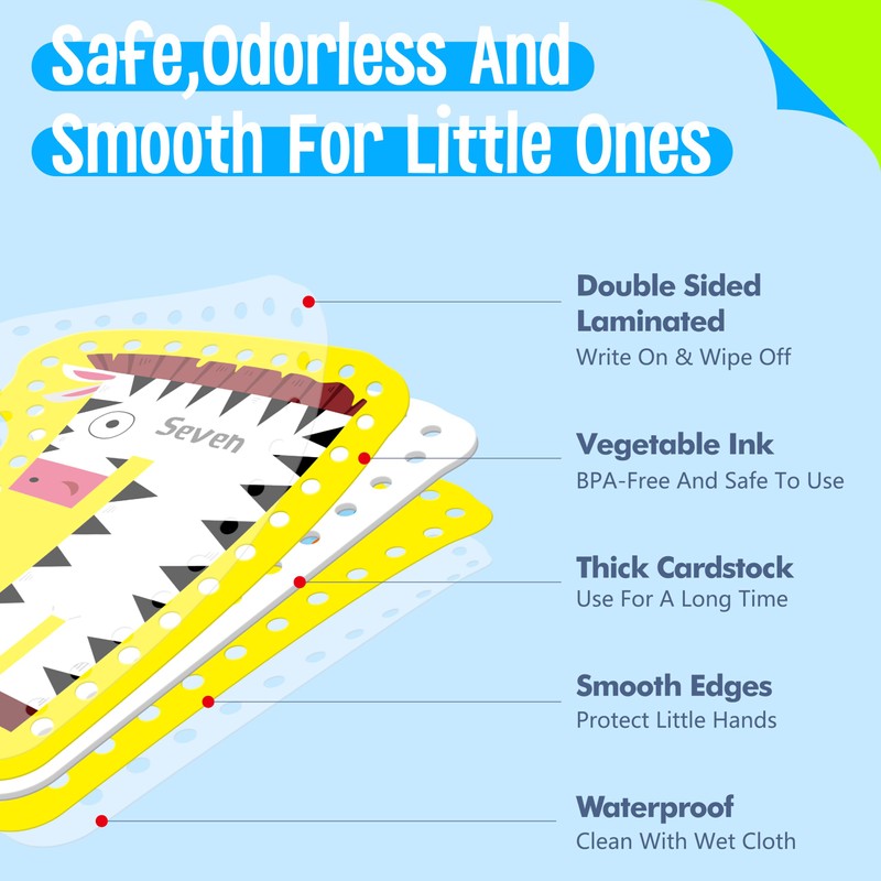 Double-sided Printing: One side of the card is an adorable animal in a number-shape, another side is the corresponding amount of this number (Especially explained the concept of zero). The patterns on cards are colorful, big and vibrant. The holes are clearly cut and easy for preschoolers to work with. The strings are easy for children to use and fit into the holes easily.