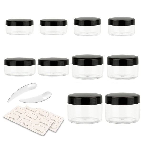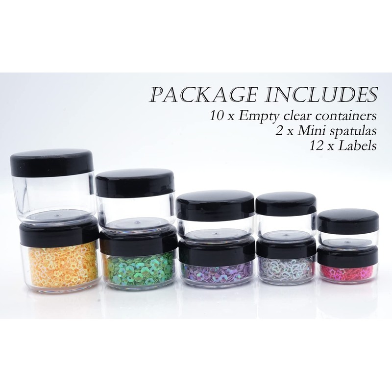 • 【PACKAGE INCLUDED】Come in 5 different volumes with 3gram, 5gram, 10gram, 15gram, and 20gram sample jars. Each of the volumes has 2 pieces of travel jars, convenient for different use. 2 pieces of mini cosmetic spatulas help you easy to sample your beauty products. 12 pieces labels help you tag products.