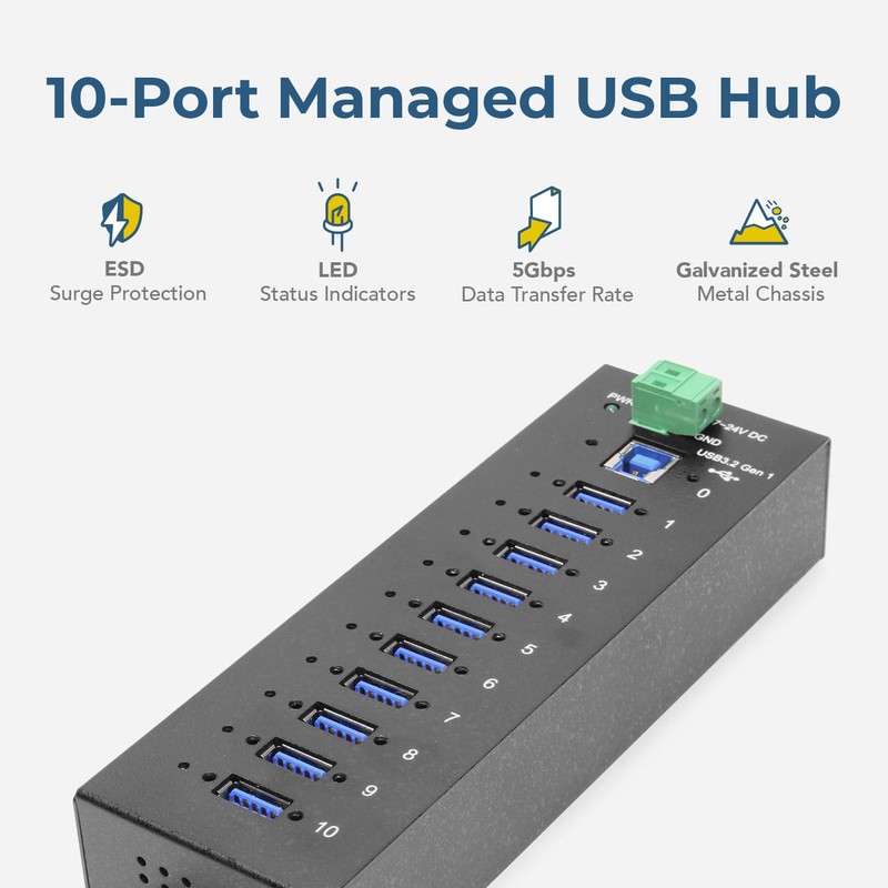 10 Port Managed USB 3.2 Gen 1 Hub w/ 15KV ESD Surge Protection Per Port