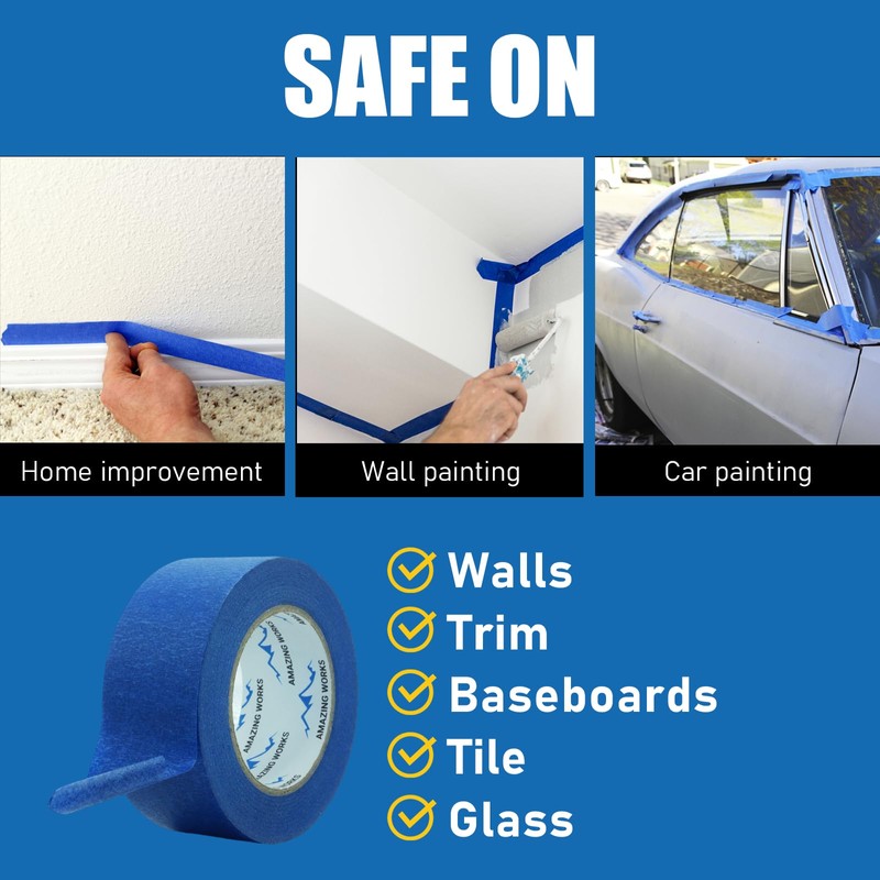- Residue-free: Made of crepe paper with a premium adhesive for easy placement. Our blue masking tape is designed for use on multiple surfaces, including smooth or lightly textured walls, trim, baseboards, tile, and glass.