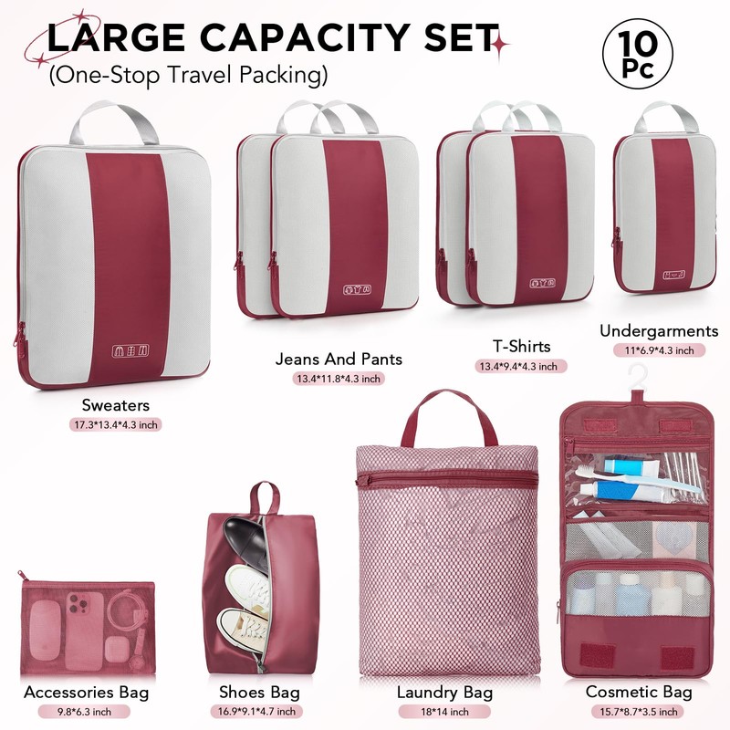 10 Set Compression Packing Cubes for Travel Essentials,Compressible Expandable Packing Cubes for Suitcase,OlarHike Luggage Organizer Bags for Travel,Handy Helper for Organizing Clothes(Wine Red)
