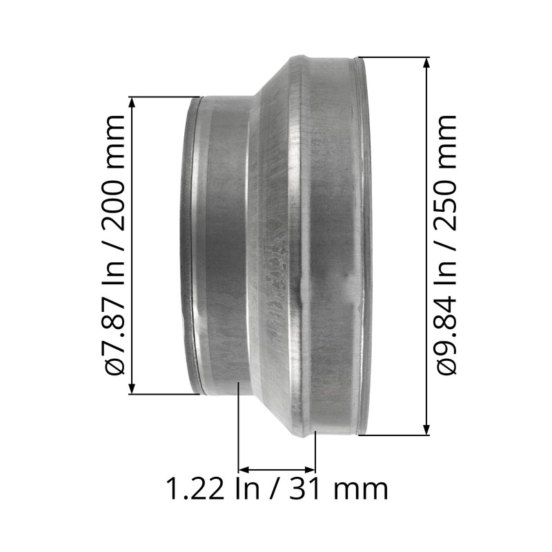 - Round Ducting Adapter: Converts 10" (9.84") to 8" (7.87") / 250mm Male to 200mm Male Sizes