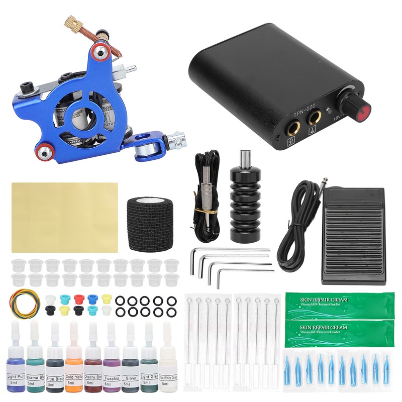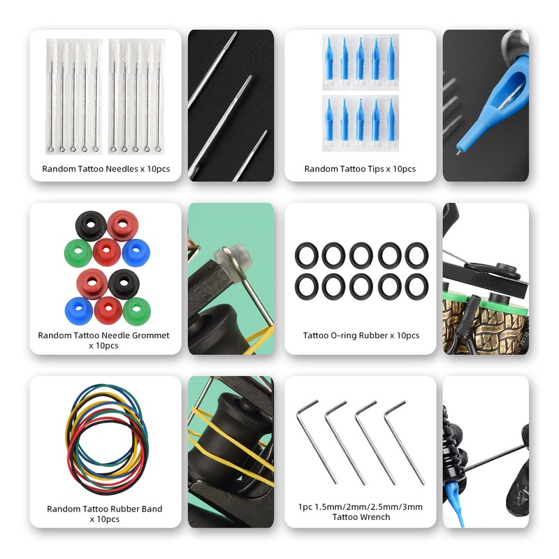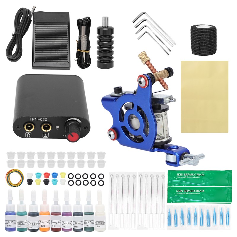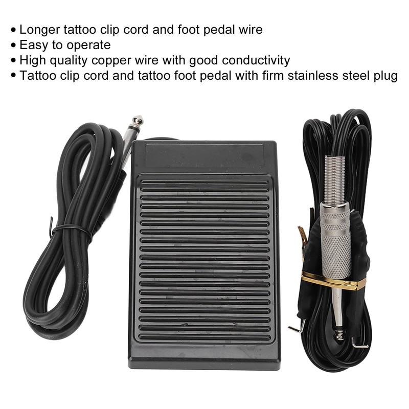 1、Precise Tattoos: Tattoo coil machine load voltage is about 4‑7V, runs fast and penetrates deep into the skin to create precise tattoos, tattoo artist can adjust the frequency and length of the needle. 2、Adjustable Voltage: Tattoo power supply is small in size, light in weight, easy to carry and store, with powerful motor, adjustable voltage 0‑18V, which is convenient for tattoo artists to use. 3、Disposable Needles: Stainless steel tattoo needles are disposable use, with continuous needle and higher penetration, equip with corresponding tattoo needle tip, convenient for beginners to use. 4、Convenient Operation: Longer tattoo clip cord and foot pedal wire made of copper material, with good conductivity, which is convenient for operate and move the body in tattoo work. 5、Complete Tattoo Kit: Equipped with 9 colors tattoo ink, tattoo repair cream and silicone practice skin, imitate the structural characteristics of human skin, suitable for beginners and professional tattoo artists.