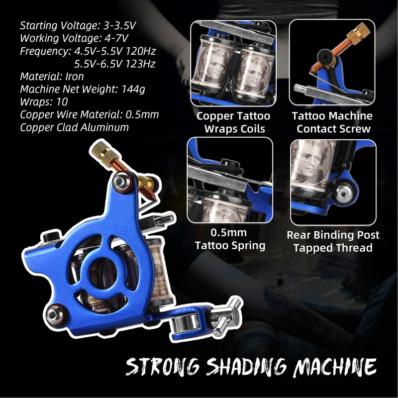 10 Wraps Tattoo Coil Machine Working Frequency: 4.5V-5.5V 120Hz, 5.5V-6.5V 123Hz