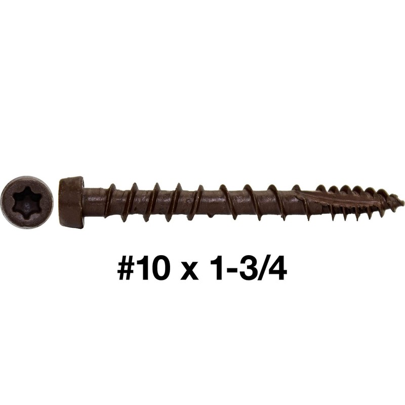 10 x 1-3/4" Mocha Composite Decking Screws. Exterior Coated, Pressure Treated and ACQ Lumber Compatible. Use T20 Torx/Star Dive Bit (1 Pound ~130 Screws)