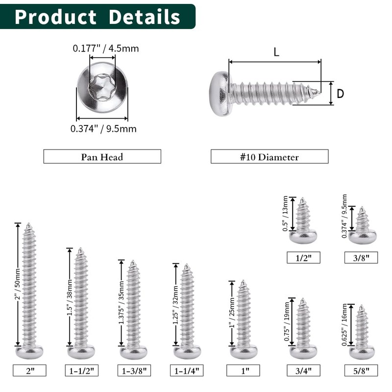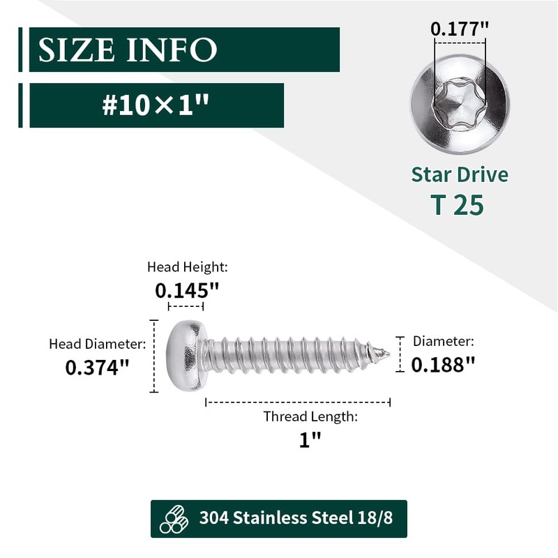 - Screw Specifications: #10 thread size (4.8mm diameter), 1" length (25mm), Length measured from under head