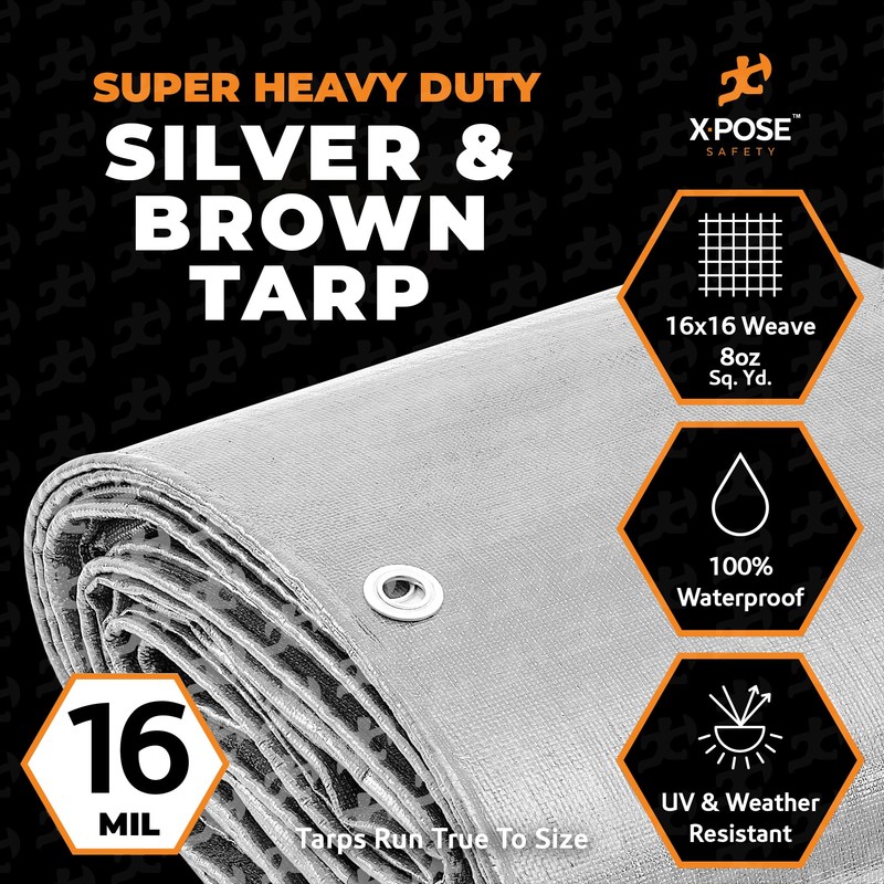 10' x 12' Super Heavy Duty 16 Mil Silver/Brown Poly Tarp Cover - Thick Waterproof, UV Resistant, Rip and Tear Proof Tarpaulin with Grommets and Reinforced Edges - by Xpose Safety