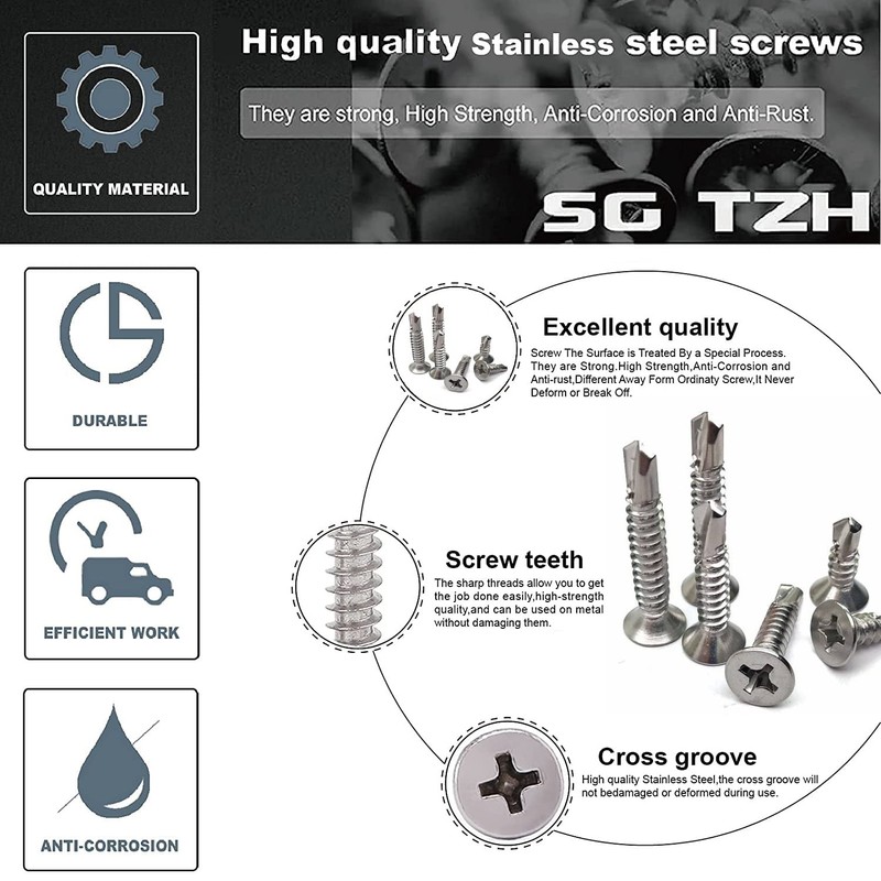- RUGGED AND DURABLE - SG TZH Sheet Metal Screws made of high-quality 410 Stainless Steel,which has higher corrosion resistance and anti-rust effect than ordinary screws, longer service life, not easy to damage, more solid.(TIPS: They are stainless 410 Stainless so they are also still magnetic. )