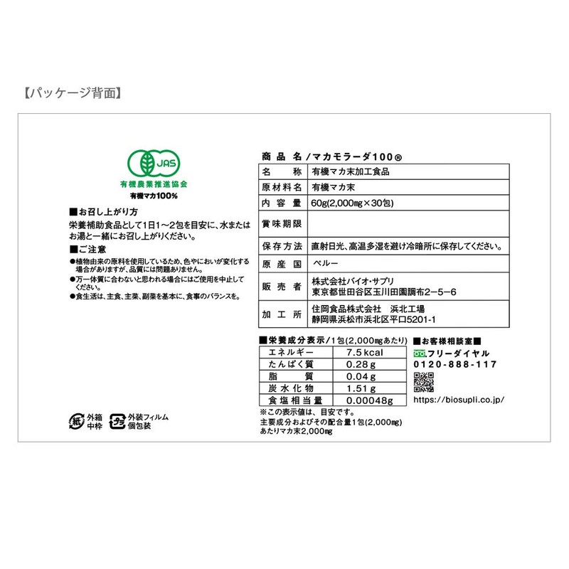 バイオサプリ 有機マカモラーダ100 無添加 100%オーガニック 妊活の栄養補給に 2,000mg/1包あたり 顆粒スティック (30包×3箱)