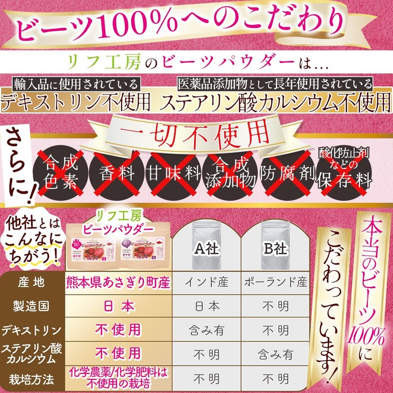 リフ工房 熊本県 あさぎり町産100% ビーツパウダー 100g×3袋セット (粗粉末タイプ/使い捨てスプーン付き)パッケージリニューアル品 国産原料100%使用 無化学肥料/無化学農薬栽培 デキストリン不使用 合成色素/香料/甘味料/保存料/防腐剤不使用 純国産 beetroot powder