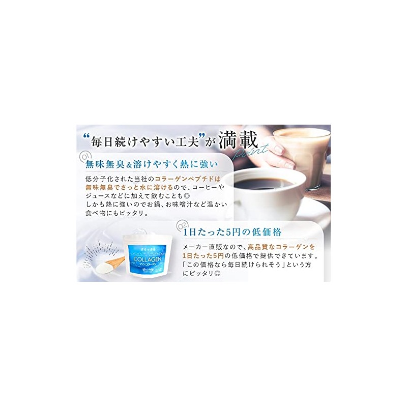 ・低価格な粉末コラーゲンにはありがちな、ダマになって溶けにくい・臭いがキツイ等はありません。