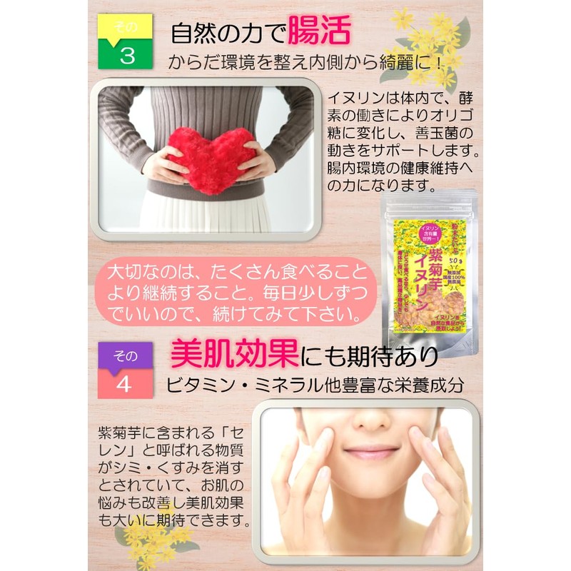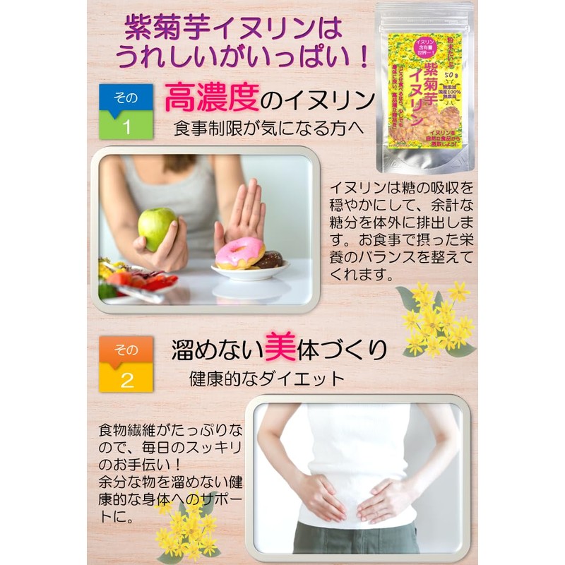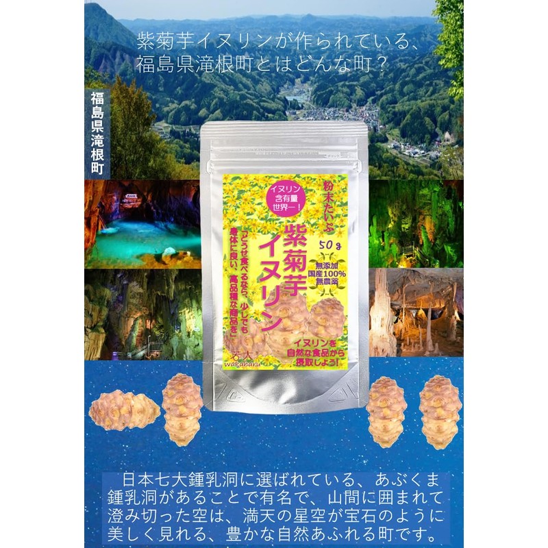 - ✅【紫菊芋イヌリンとは】 福島県滝根町産の紫菊芋を100%使用して、日常で手軽に取り入れられるように作られた、紫菊芋のパウダー商品になります。イヌリン含有量が55%前後と高く白菊芋の約1.5倍あります。また高濃度のイヌリンのほか、豊富な栄養価が高く残るように製造しております。薬ではなく自然の作物で高い健康増進効果が得られるのは、体にとってとても良いことです。