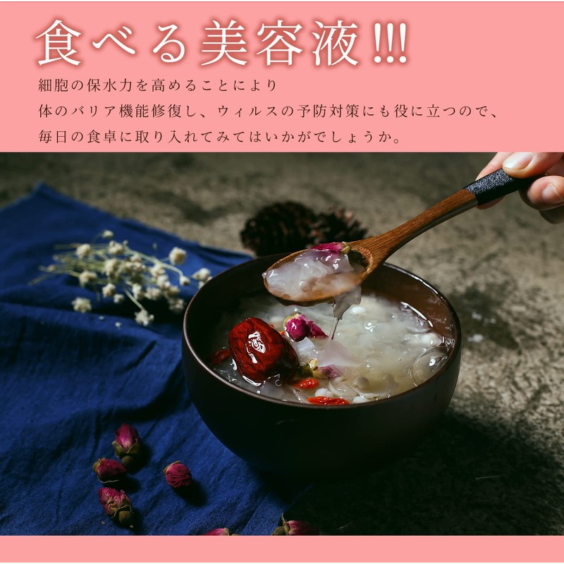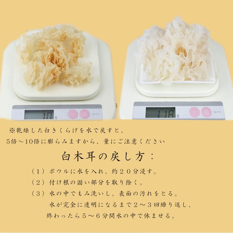 - 【原材料名】白木耳(銀耳)【内容量】100g【賞味期限】パケージに記載【産地】中国 【保存方法】直射日光、高温多湿を避けて保存して下さい。