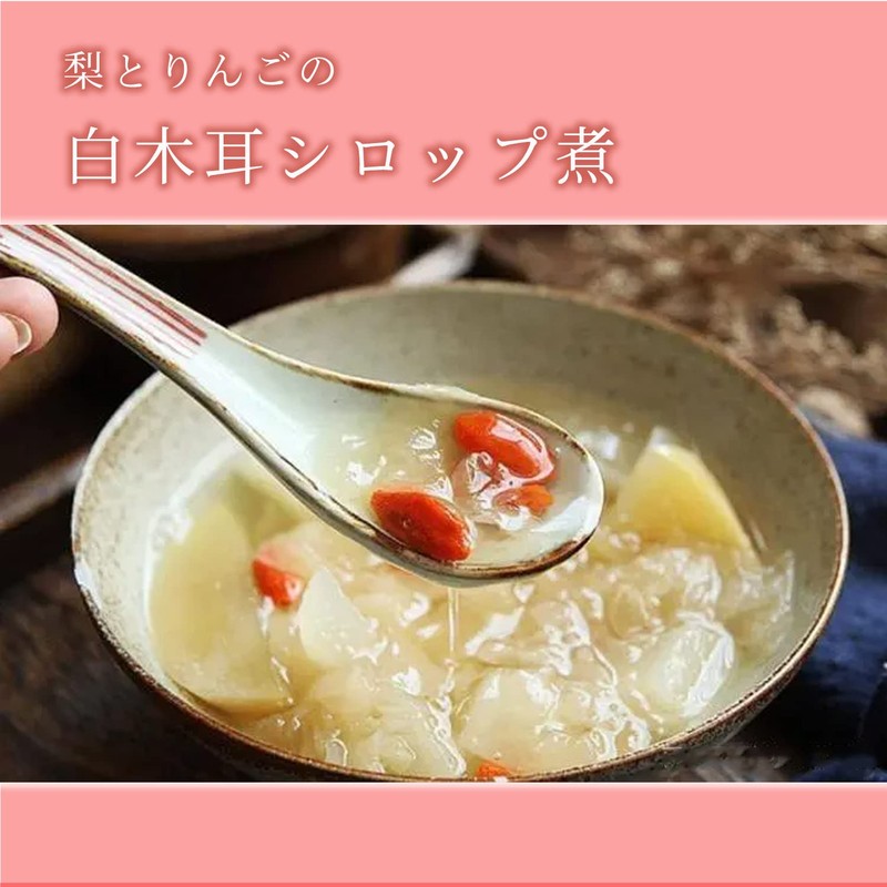 - 白きくらげはコリコリで、味にも香りにもクセがなく、食感を楽しめるもの。ジャンルを問わず、どんな料理にも使いやすいのが特徴です。●20~30分水につけるでけで使えるとても便利な食材で、また保存がとても簡単なので常備してもいい商品です。●和え物、炒め物、スープやお鍋に。●デザートやスイーツにも広く利用されています。「銀耳雪梨糖水」という、白きくらげと梨を使った甘いスープは、薬膳スイーツとして有名ですね。