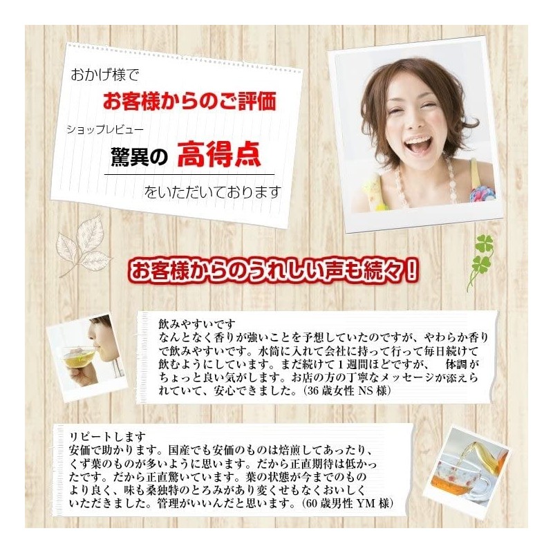 - 味と香り:やや甘みのある草の香り クセのない烏龍茶系の味 カフェイン:カフェインレス
