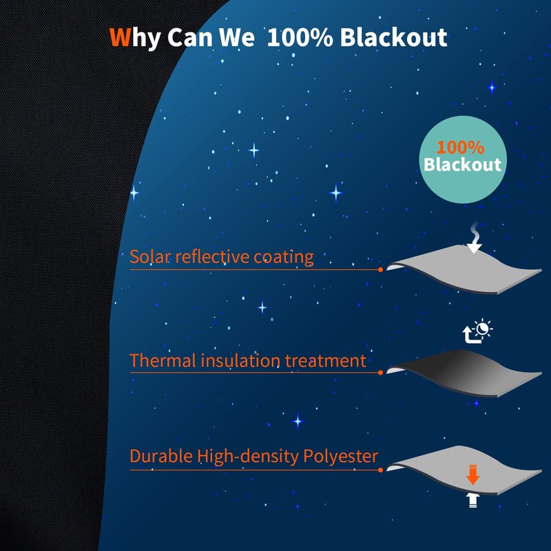 • [ Why Can We 100% Blackout] Our 100% Blackout curtains are made of innovative triple - blackout technology. Solar reflective coating, Thermal insulation treatment and Durable High-density Polyester. Our 100% bright sunlight and UV ray, turn day into night, enjoy your sweet sleeping and protect your furniture from color fading, providing privacy in your place.