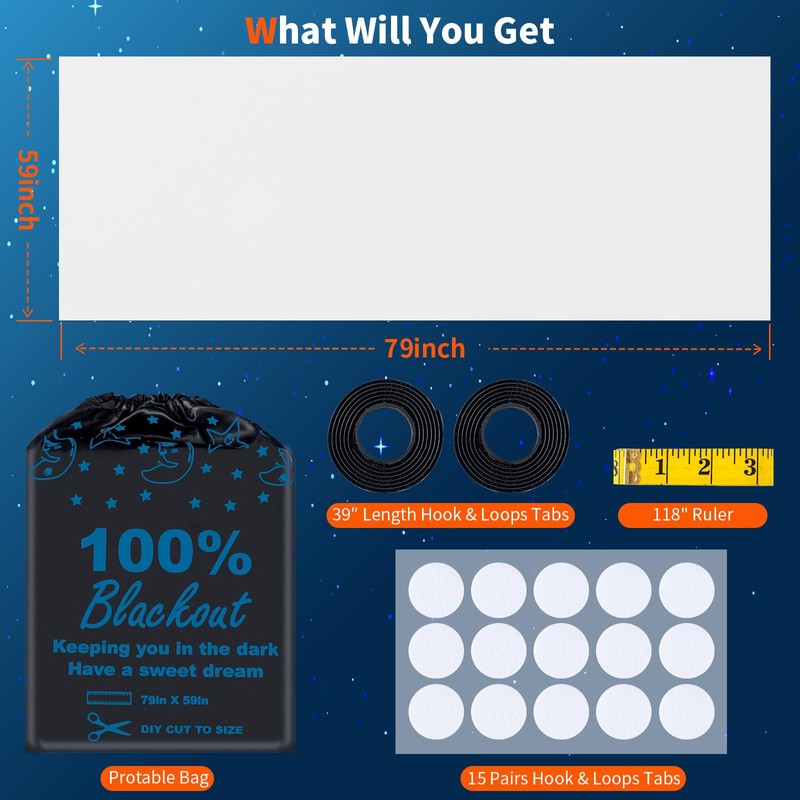 • *💕[ WHAT'S IN THE PACKAGE]*💕You can get 1 *79"x 59" blackout shades, 1 * ruler, 15 pairs * Hook & Loop Tabs, 39" Length Hook & Loop Tabs, 1 * travel bag. Our philosophy is to serve every customer. Whatever the issue you meet, feel free to contact us to find a satisfying solution. We provide 36 Months warranty and lifetime support.