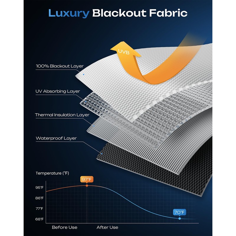- 【100% Blackout】:LEIYER 100% blackout blind is engineered with triple-layer blackout material to completely block sunlight and UV rays. Made of polyester with silver-coated backing, the portable blackout curtain reflects 95% of heat radiation