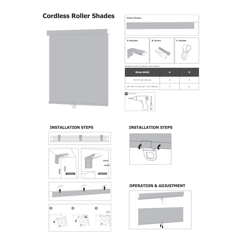 • 【HOW TO CHOOSE THE SIZE】:For example, if your window is 23“ wide and less than 72” high; Inside Installation: blackout shades Width = 23“; blackout shades Height = 72”. Outside Installation: blackout shades Width = 23“ + 4” = 27“; blackout shades Height = 72”. (PS: In actual use, the fabric height of our shades for indoor windows may exceed 72 inches by 2-3 inches.)
