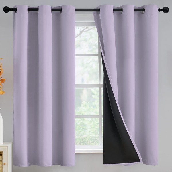 100% Blackout Window Curtain Panels for Bedroom, Heat and Full Light Blocking Drapes with Black Liner for Nursery, Thermal Insulated Solid Grommet Panels for Living Room, 42Wx63L, Lilac, 2 Panels