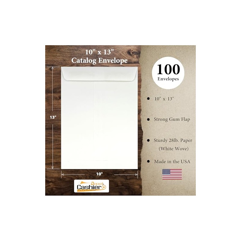 100 Cashier Depot 10" x 13" Catalog Envelope, Durable 28lb White, Deep Gum Flap, 100 Envelopes
