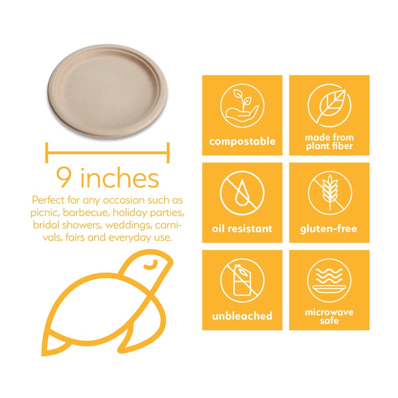 Our Earth's Natural Alternative 9" all occasion heavy-duty plate is made from 100 percent sustainable and renewable natural wheat stalk fiber and bagasse (sugarcane fiber). The material is derived from the plant stalk, not the actual food grains, which are where the proteins and allergens are stored, which makes them by FDA standards gluten-free. They are an environmentally beneficial tree-free alternative to Plastic or Styrofoam, which contain non- biodegradable and petroleum derived materials or paper, which manufacturing requires the cutting down of trees. They are compostable in either a industrial compost (1-6 months) or a home compost (up to 12 months). Built sturdy from environmentally beneficial natural, renewable plant fibers, they can be used in the microwave - as they are heat safe up to 200 degrees Fahrenheit - and are oil/liquid and cut resistant. The coloring is perfect for any occasion - picnic, barbecue, church luncheons, holiday parties and get togethers, bridal showers, weddings, carnivals, fairs or everyday use. Contains 125 in each case.