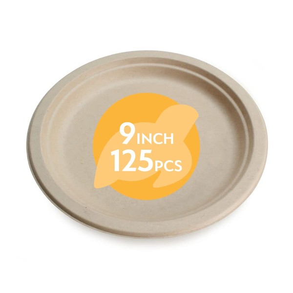 100% Compostable Disposable Paper Plates Bulk [9" 125 Pack], Bamboo Plates, Eco Friendly, Biodegradable, Sturdy Large Dinner Party Plates, Heavy-Duty, Unbleached by Earth's Natural Alternative