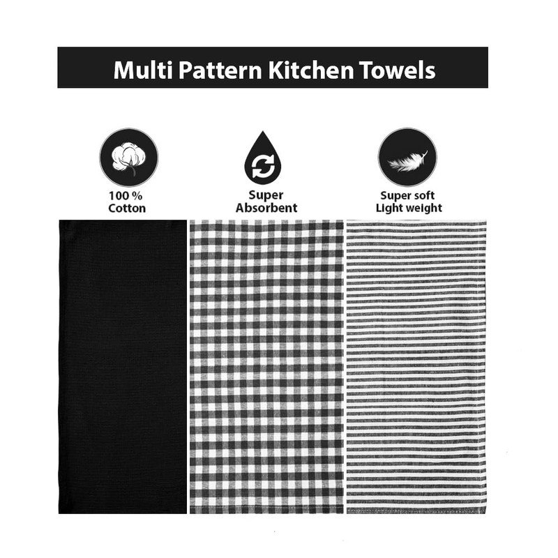 - Quality & Material: Our tea towels pack made from 100% Cotton. Our dish towels offer the perfect combination of absorbency and durability, making them the perfect addition to your kitchen. Our kitchen towels serve as the perfect alternative to tissues and paper towels and maintains its quality after numerous washes.