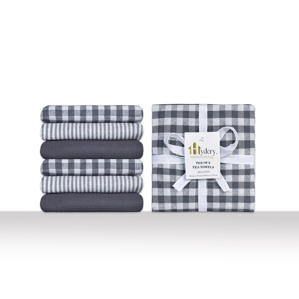 100% Cotton Kitchen Tea Towels - Super Soft, Absorbent - Long Lasting Dish Towels, 70 x 50 cm, Grey, Pack of 6