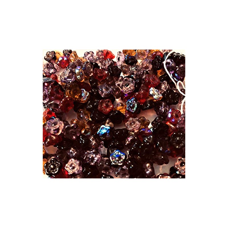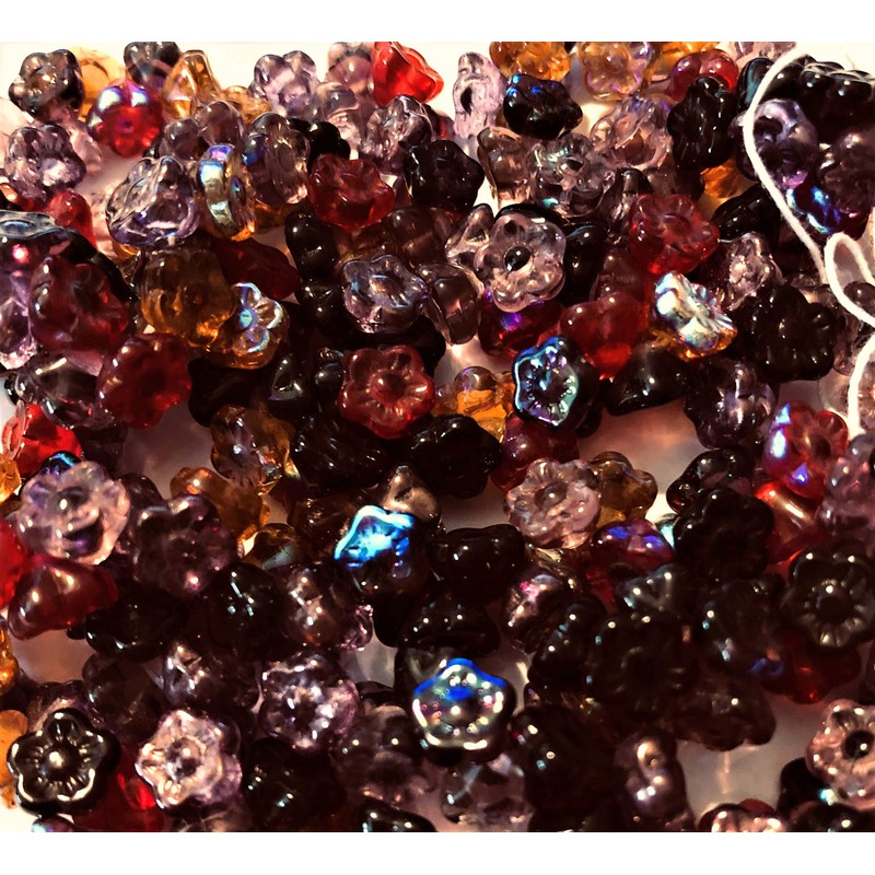 • 100 Czech Glass Flower Shaped Beads. Vineyard Mix in Wine, Rose, Bordeaux, Burgundy, Grape, Ruby and Lavender in different finishes.