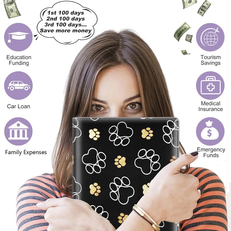 100 Envelopes Money Saving Challenge Binder, A5 Budget Binder with 25 pcs Cash Envelopes, 3 pcs Reusable Laminated Trackers Saving $5050, $500, $10000, Money Organizer,Cute Dog Paw Prints Gold White