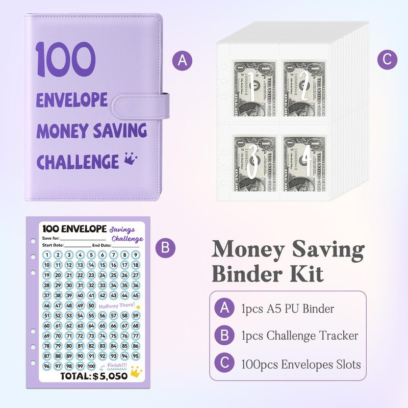 - Saving Money Binder Kit For Cash: A5 PU budget binder, 1pcs savings tracker, and 100 clear envelopes slots pre-numbered with 1 to 100. It's a great way to get the whole family involved in saving and a great tool for teaching kids to save money.