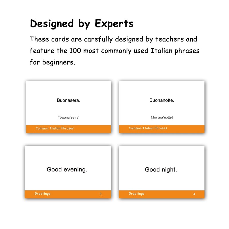 - Designed by Italian Teachers - With years of teaching experience, we have carefully selected 100 essential phrases for Italian beginners, making it easy for them to start their learning journey. This set of flashcards is simple and fun, helping beginners develop a positive attitude toward Italian and boosting their confidence in learning.