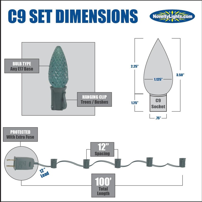 - Enjoy our retro fit traditional C9 light set with a 100' Green wire string and 125 ceramic opaque C9 light bulbs during the holidays, on your patio, gazebo, pergola, or special event. This light set is commonly referred as "retro" because it will remind you of the old fashioned type Christmas lighting that you would use on house or Christmas tree reminiscent of the 1950's holiday decorations. Still classic to this day!!!