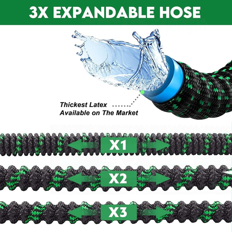 - EXPAND 33.4 FT TO 100FT MAGICALLY: When water pressure is on, the garden hose can extend up to 3 times of its original length(extending from 33.4ft to 100ft),but can retract to 33.4 feet fast when water source is turned off.
