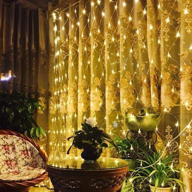 **The led net lights and the battery box are waterproof designed to withstand light rain and water spills, make it perfect for both indoors and outdoors decorations,** **such as restaurant, hotel, commercial building, shopping center, pub, club, concert, hall, cabaret, fashion show, etc.** **Can be hung on walls, windows, doors, floors, ceilings, grasses, trees, etc** **Specifications :** Material: Copper + Plastic Cable color: Transparent Led Quantity: 100pcs Light color: Warm White Light Modes: 8 Modes Size: 4.9ft*4.9ft/1.5M*1.5M Remote work: 10m Power source: 3 x AA batteries(not included) Waterproof Rate: IP44 Life Span: 40,000 hours **8 modes:** Combination In wave Sequential Slo-glo Chasing/Flash Slow fade Twinkle/Flash Steady on **Dimmable function** Press DIM- or press DIM+ of remote control to adjust the brightness of the lights. **Timer function:** Automatic cycling timer (6 hours on, 18 hours off over each 24 hour period). **Memory function:** Built-in memory chip recalls the last function set. **Guarantee:** We have a quality guaranteed. Any problem, please contact us, we will help you solve it, hope for good cooperation. **Package include:** 1x 100 LED Net String Light 1x Remote
