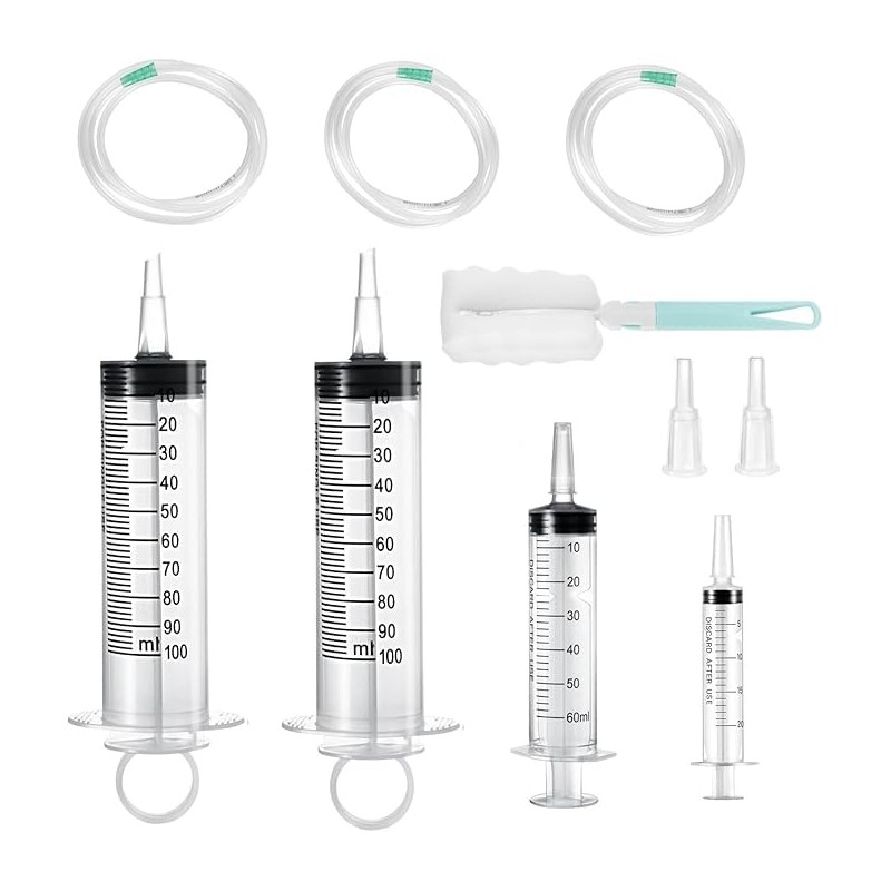 - 100ml spritze 2, 20ml spritze 1, 60ml spritze 1, 60ml spritze 1, binde 2, 1m rohr3 und natürlich 1 packung schwämmchen