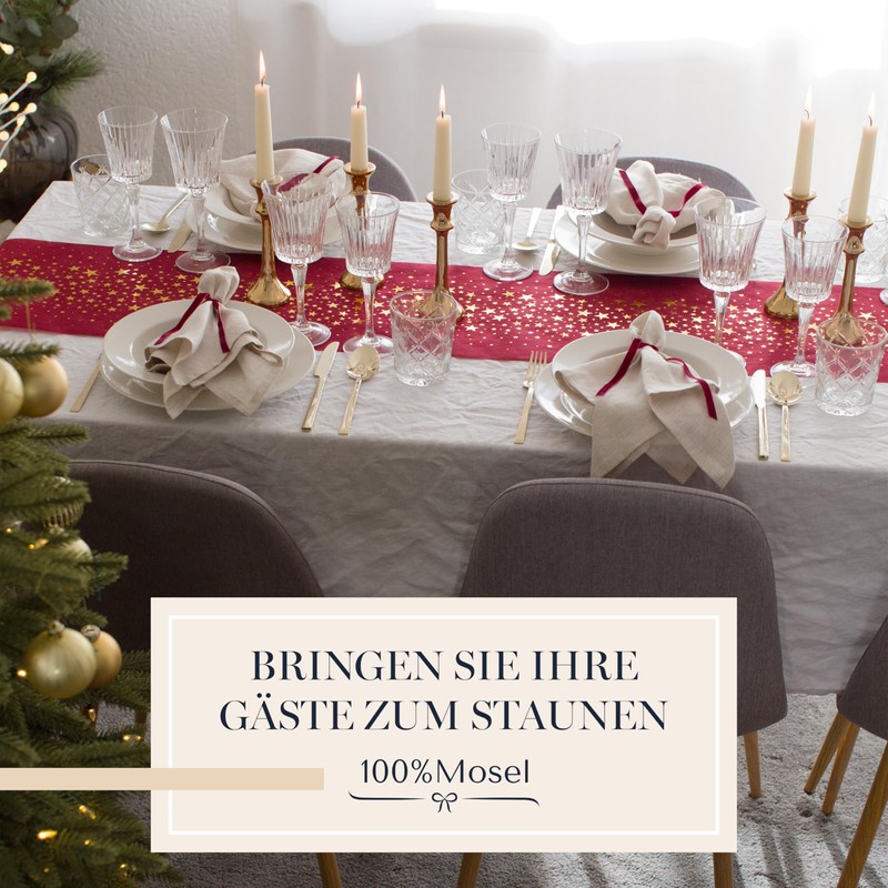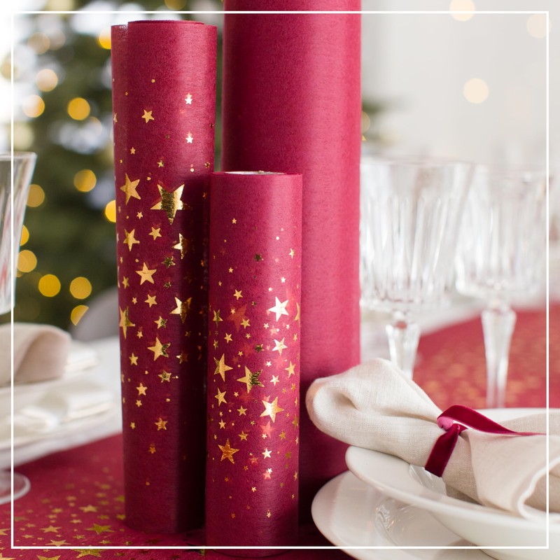 - Box contents: 1 x non-woven table runner roll (28 cm x 5 m), made of polyester fabric with slight transparency in burgundy red with golden stars of 100%Mosel