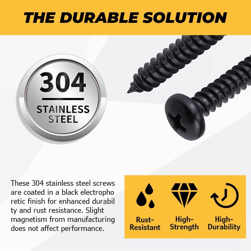 100-pack #8 x 1-1/4" Black Pan Head Self Tapping Screws for Wood/Sheet Metal/Plastic, Stainless Steel 304(18/8), Rust Resistant, Phillips Bit Included