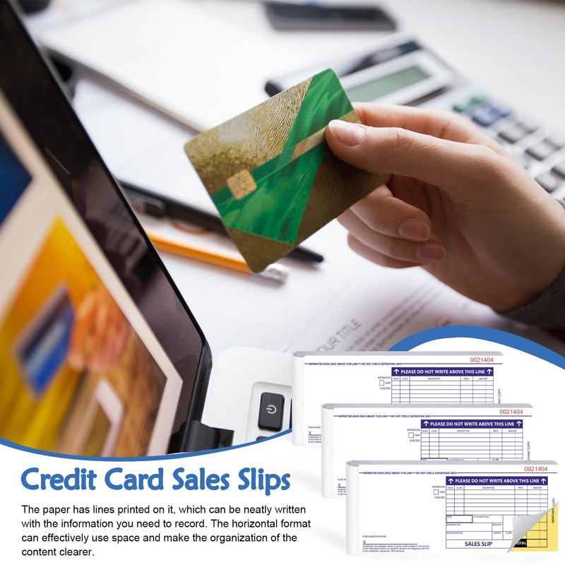 - Long Credit Card Sales Slips: 7.9*3.3inch. They are the ideal size for sales credit card operations and records. Our credit card sales receipt books are portable and easy to operate; this compact size ensures that they are not heavy to carry while having enough space to record detailed information about your sales credit cards.