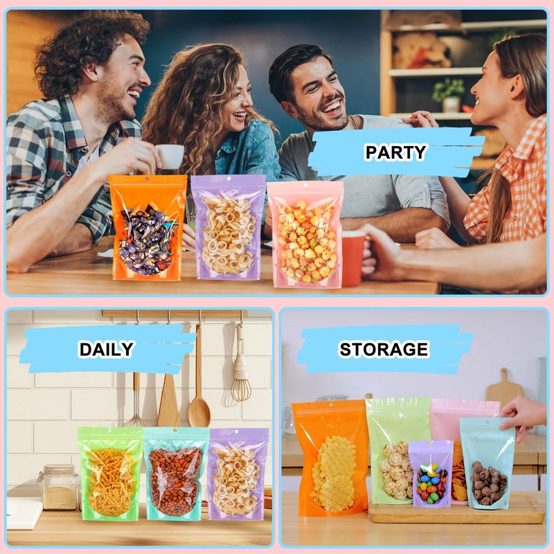 - 【Stay Organized, stay healthy with resealable mylar bags】: The stand up pouches come with a clear front and colorful back, which showcase contents without opening.Our sealable treat bags with with sealing strip can save more time as you can grab the smell proof bag you need quickly. The stand up resealable food bags save more space and keep your kitchen organized.