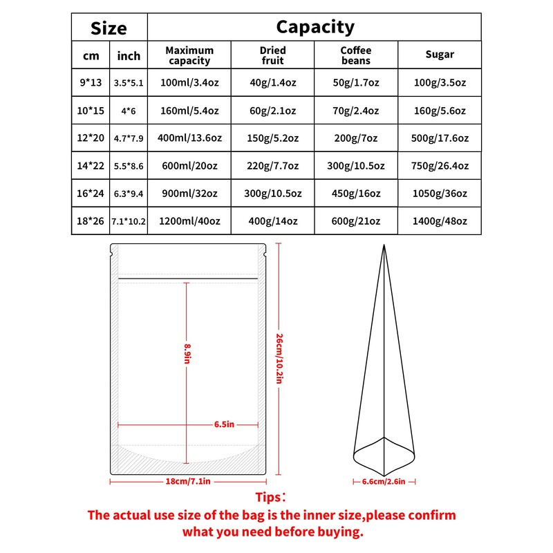 - Quantity and Material:Package include 100 pieces black stand up pouches.Outer dimension:7.1x10.2 inches,Inner dimension:6.5x8.9 inches;The resealable bags are made from food grade plastic,which is odorless,reusable and moisture proof,keeps your products freshness.Practical bags for packing product