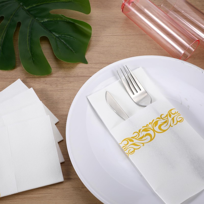 100 Pack White and Gold Napkins Disposable Linen Feel Dinner Napkins with Built-in Flatware Pocket Gold Trim Lined Pre Folded Napkins Cloth for Wedding Dinner Party Events