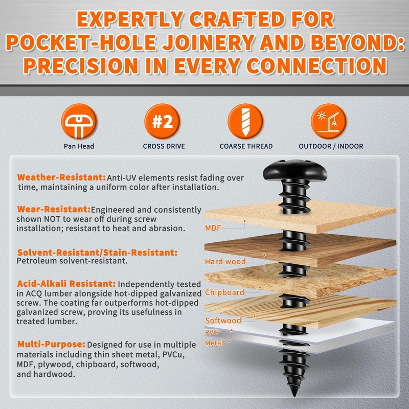 - 【Premium Rust-Resistant Material】Discover the unmatched strength of TPOHH multipurpose wood screws, forged from high-grade 18-8 (A2) stainless steel known for its superior rust-resistant properties. The black anti-corrosive coating ensures durability, having surpassed 500 hours in salt spray tests, promising longevity in even the harshest environments, including applications involving ACQ-treated lumber.