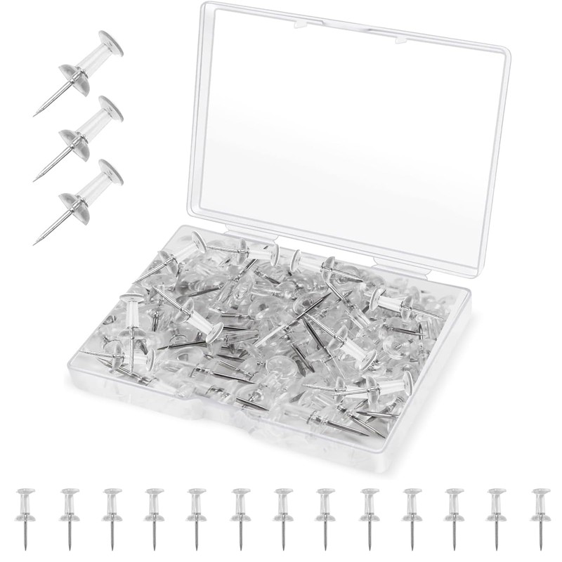 100 Pcs Clear Push Pins, Drawing Pins Thumb Tacks with Storage Box for Home Office Pin Board Notice Board