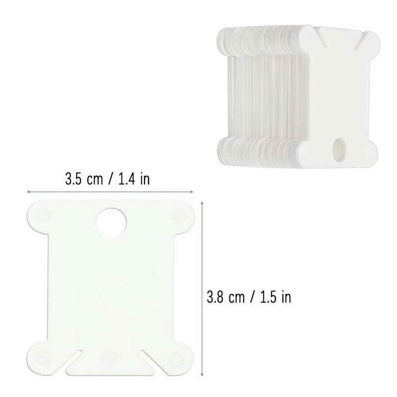 - Size & Quantity: These floss bobbins are approximately 38mm in length, 35mm in width or 1.5 inch x 1.4 inch. Each packs contains 100pcs, good quantity for organizing your collection of threads or embroidery floss while keeping some as spare. White in color.