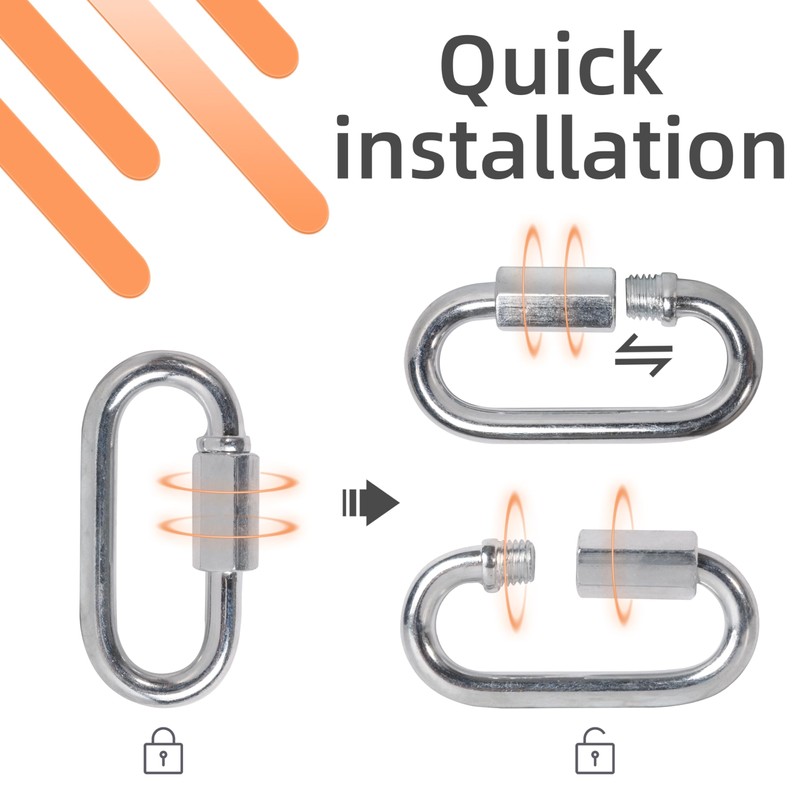 - 【Quick Link specifications】:Overall size: M6 X 60 mm carabiner clips; length: 2.3 inches; diameter: 1/4 inch; high-strength steel construction, these quick links have a load capacity of 660 lbs, ensuring secure connections