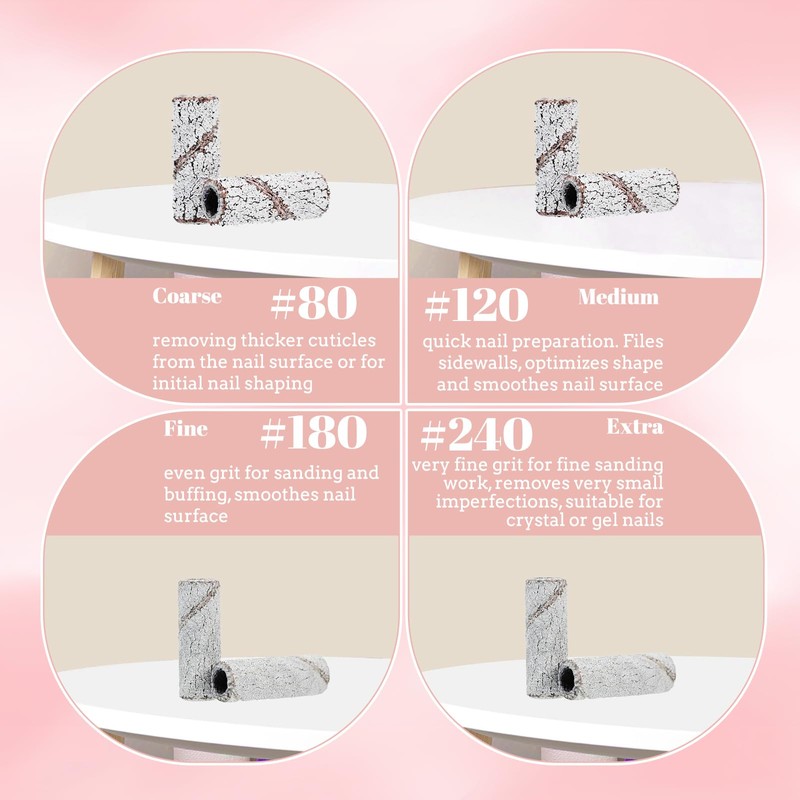 180 grit sanding bands: Refines and smoothens nails, creating a smoother surface before applying polish or nail art.