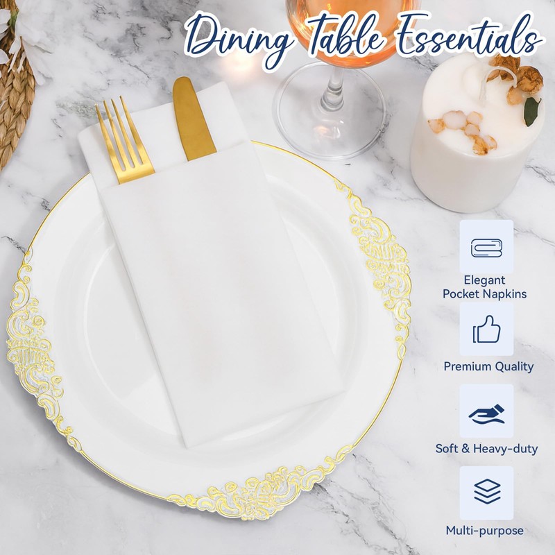 - Innovative Pocket Design: These prefolded cloth like paper napkins feature a convenient built-in pocket to securely hold cutlery in place during meals. The pre-folded design keeps silverware sanitary and stationary until needed, while maintaining a neat, upscale presentation for any dining occasion. Perfect alternative to traditional cloth napkins.