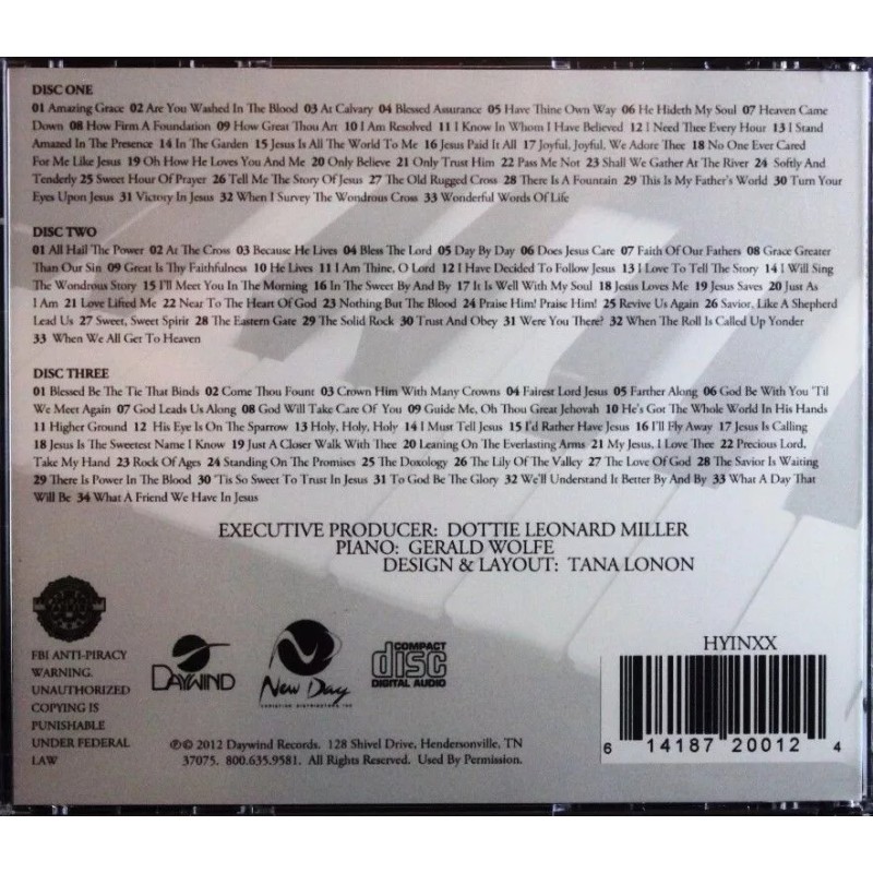 This three-CD set is a comprehensive collection of cherished 100 piano southern gospel hymns. The music is soothing and reverent and Mr. Wolfe puts so much emotion into it that you can feel the presence of God. including "Blessed Assurance," "In the Sweet By and By," "I'll Fly Away," and many more.
